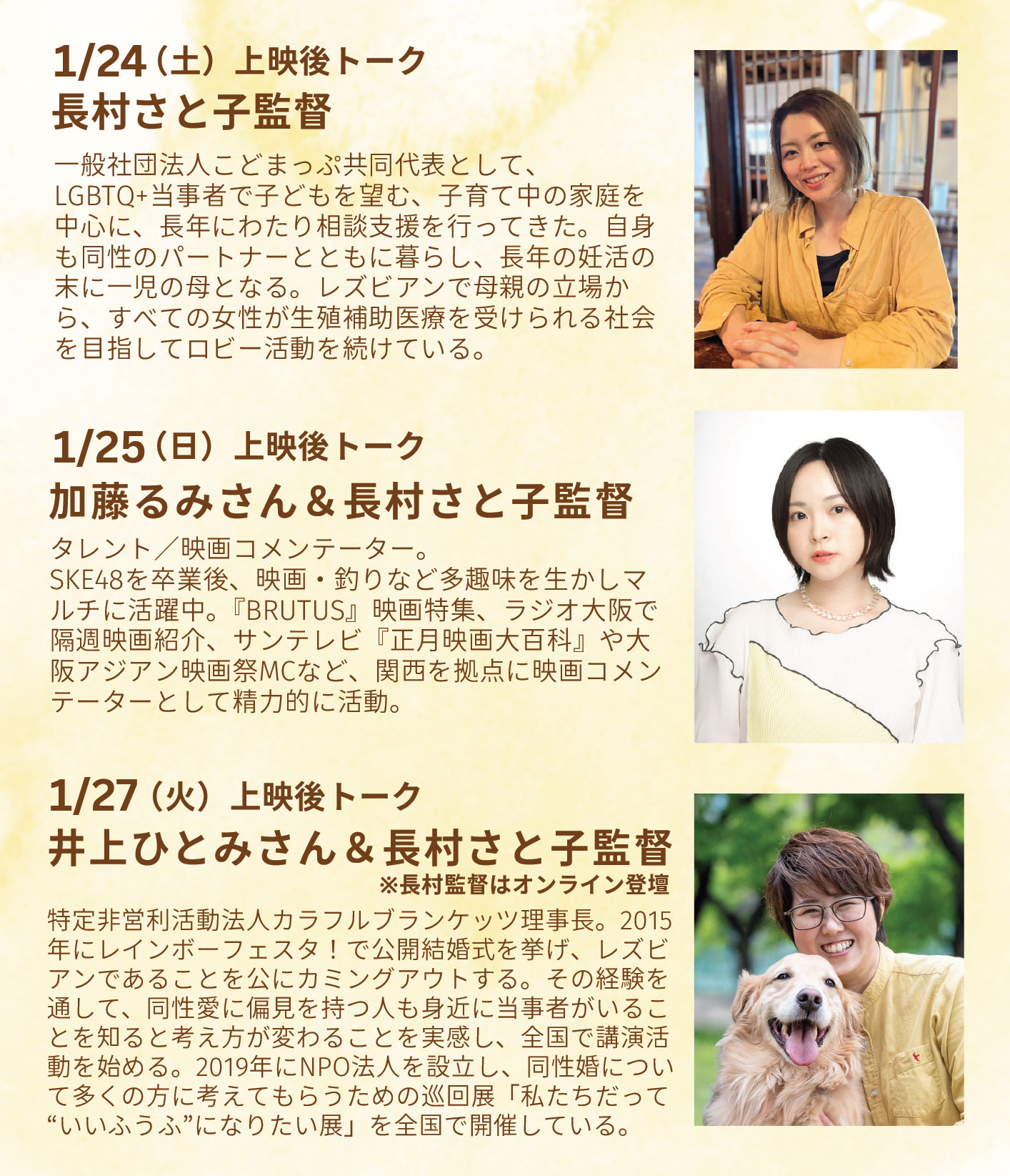 親である・親になりたい四組の同性カップルの「家族」への想い 私たちの関係性は、一体誰が決めるのだろう? 確かな“家族”として暮らす、4組の同性カップルの愛と日常の記録 同性婚が認められていない日本にも、子どもを育てている同性カップルの「家族」はたくさん存在します。 しかしその大多数が、差別や偏見を懸念し、関係性を隠して暮らしています。 そんな「見えない」家族のことを知ってもらいたいと4組の「子どもを育てている/子どもを望む」同性カップルの日常をカメラに収めました。 精子提供をしてもらった友人と本人の両親たちと一緒に、生まれたばかりの赤ちゃんを育てるカップル。 ステップファミリーになるために同棲を始めたシングルマザーと同性のパートナーのカップル。 長年不妊治療に時間もお金も心も注いできたが、様々な「期限」にプレッシャーを感じているカップル。 精子バンクを通じた精子提供で生まれ、育ててきた娘がまもなく成人を迎えるカップル。 4組4様の「家族」の選択のなかにある、子どもへの愛情、子育ての悩み、未来への願い……。 「ふたりのまま」の思いに耳を傾けます。
