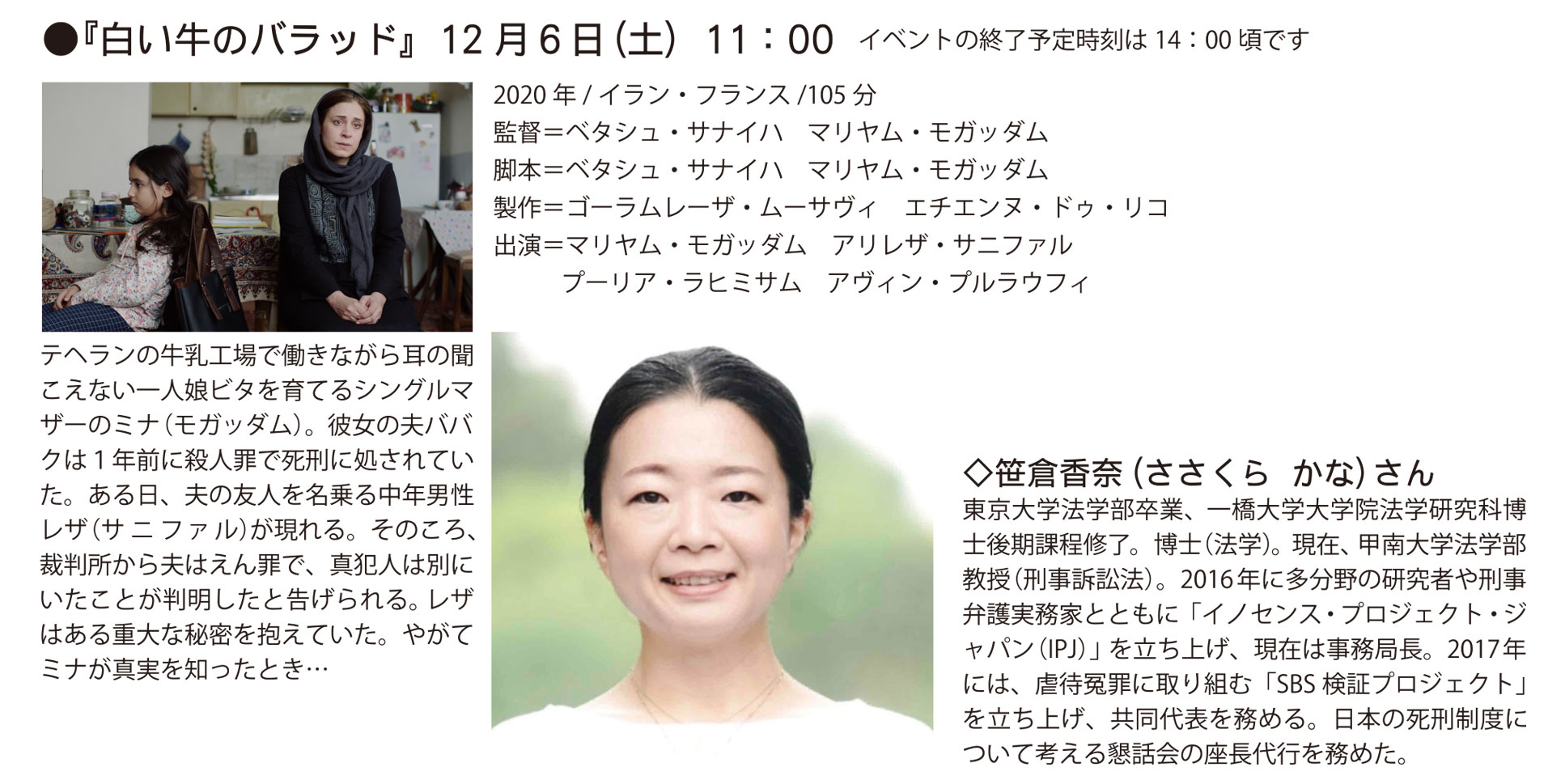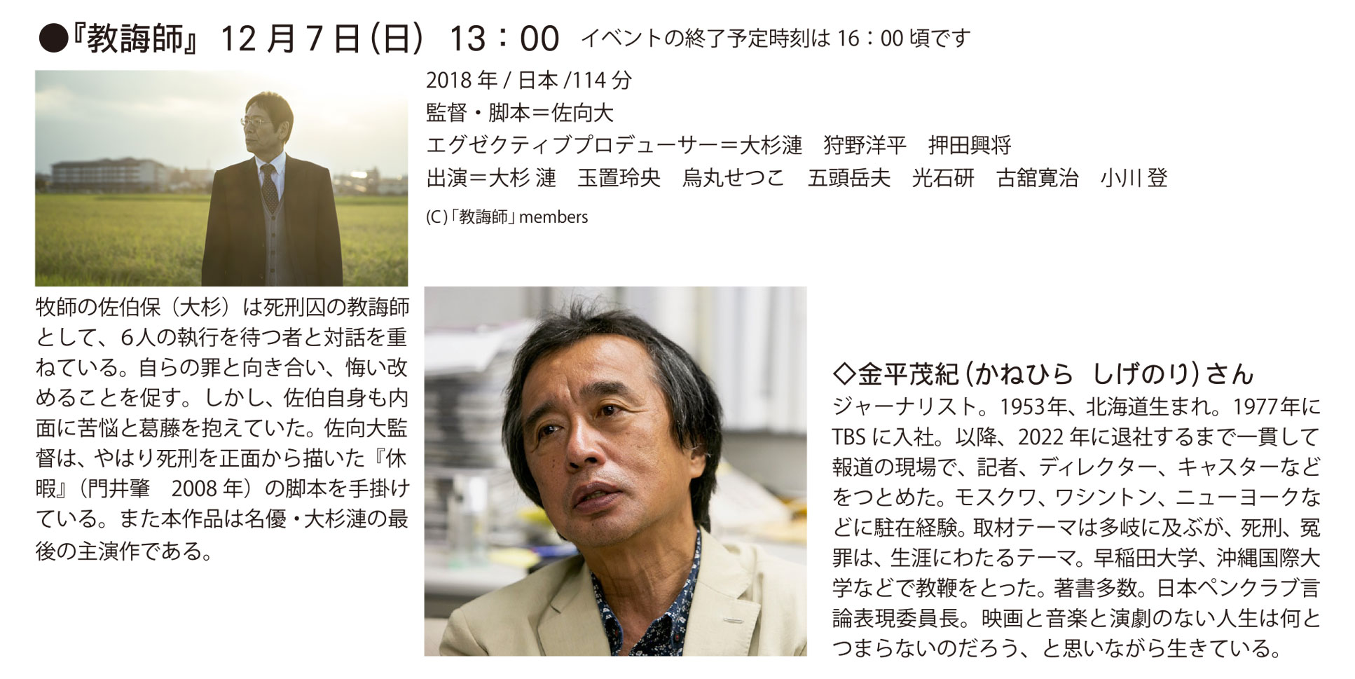 2025年6月27日、日本では2年11カ月ぶりに死別が執行されました。世界の7割以上の国が死刑を廃止・停止する中で、日本では国民の8割以上が死刑存置を支持。それを根拠に、国は刑の執行を続けています。死刑は国家による究極の権力行使です。にもかかわらず、日本ではほとんど情報が公開されていません。映画という虚構を通して「死刑」を可視化したい、みなさんに関心をもっていただきたい、それが私たちの願いです。映画の「問いかけ」に対する反応は、千差万別。見る人の数だけ存在すると思います。共感、反発、憎悪…。今回は映画の後、ゲストによるお話もあります。「国家による殺人は許されるのか?」「もし無実の人が執行されたら?」「償いとは何か?」「命とは?」「人権とは?」などについて会場で一緒に考えてみませんか。
